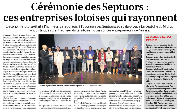 Nous avons eu l’immense plaisir de recevoir hier soir le Trophée de l’Économie – Septuors du Lot, dans la catégorie INNOVATION. Ce prix, décerné par un jury d’entreprises du département et la CCI du Lot, récompense notre engagement et nos efforts pour innover et faire avancer notre secteur. La cérémonie s’est tenue le jeudi 2 octobre à Pradines, dans une ambiance chaleureuse et inspirante, en présence des institutionnels et acteurs économiques du territoire.